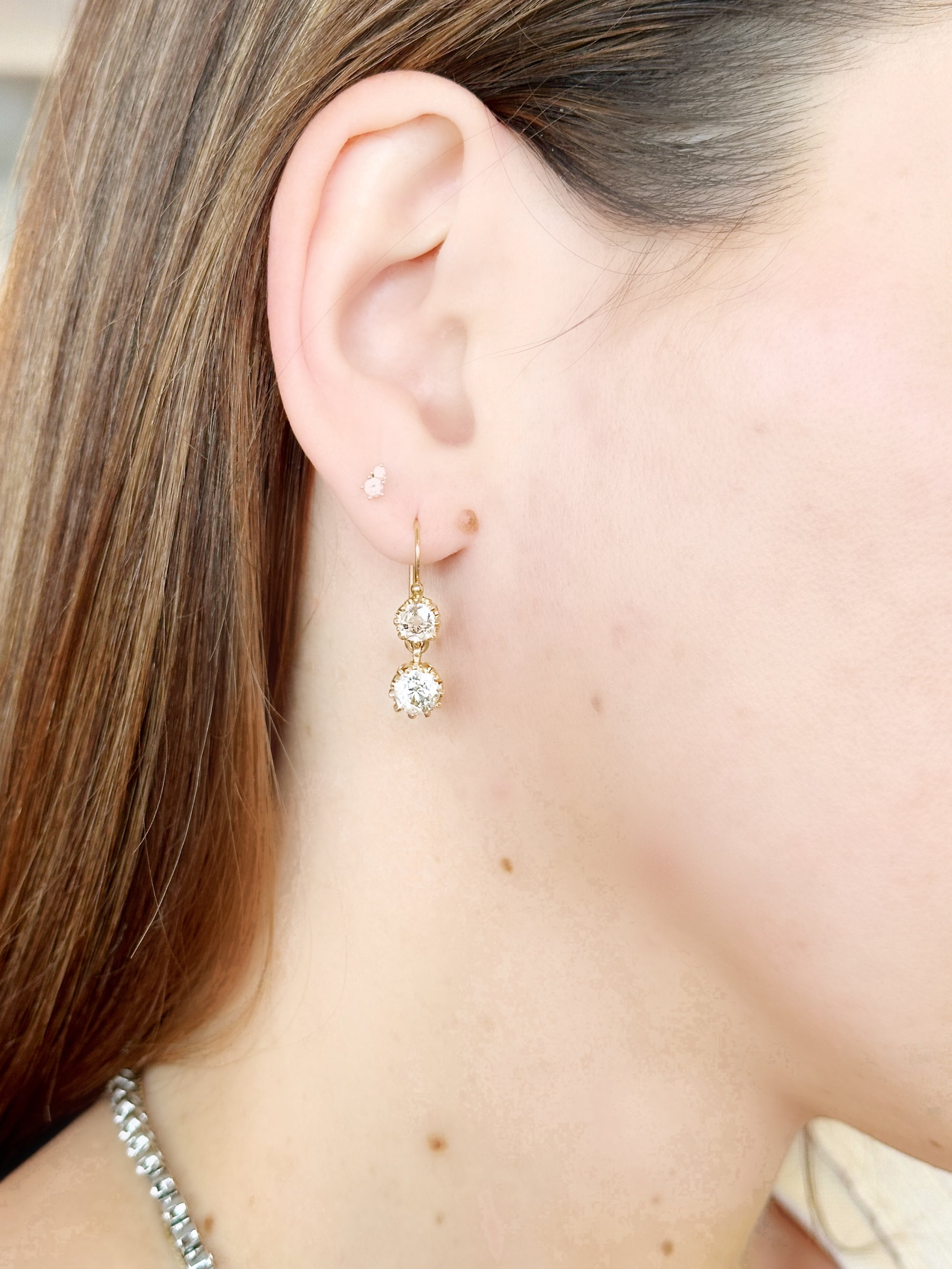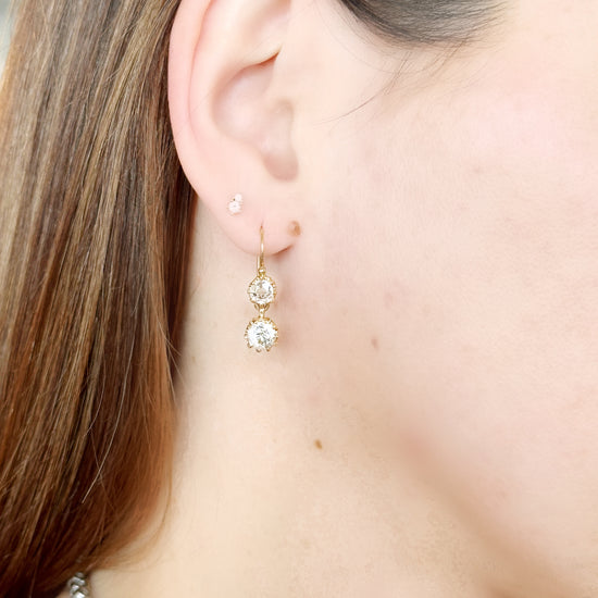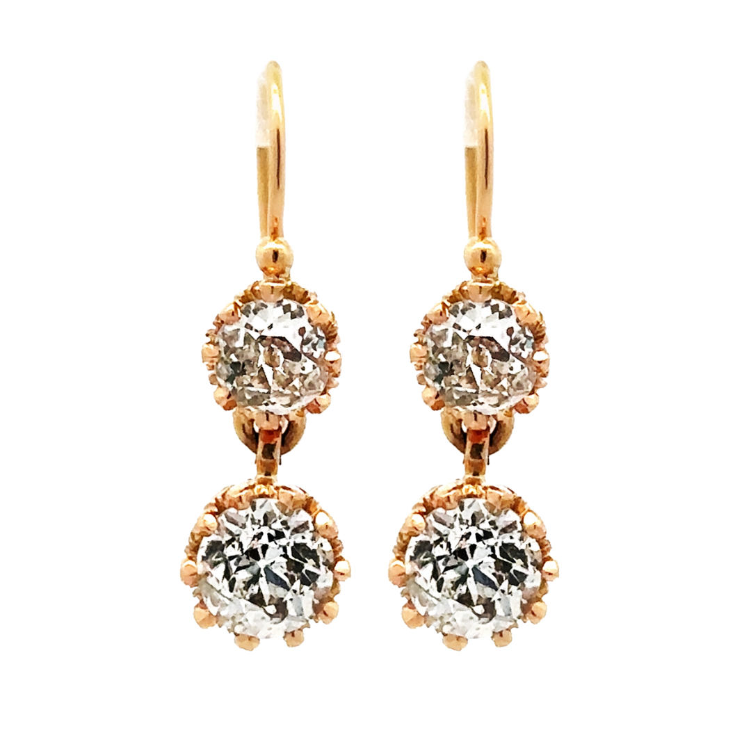 Late Victorian Era 18k yellow gold 4 diamond dangle drop earrings, approximately 4 ctw.