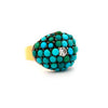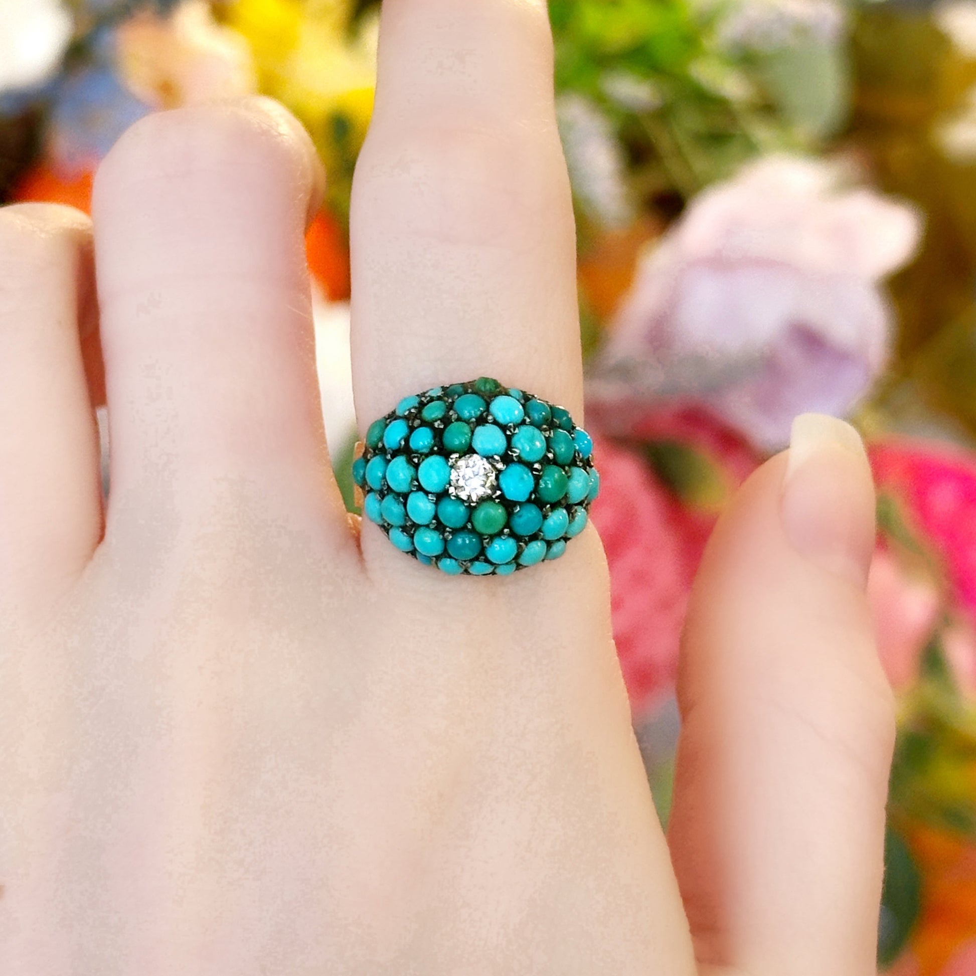 A late 1800s Victorian turquoise and diamond cluster dome ring crafted in approximately 5.5 grams of 18k yellow gold. Featuring diamonds totaling approximately 0.21 carats, this piece exudes antique charm and timeless sophistication.