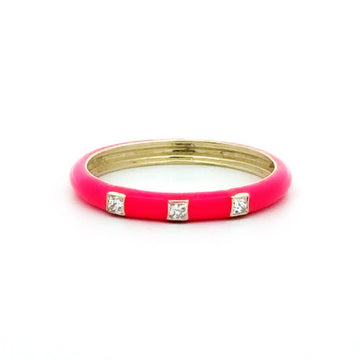 Add a POP of color and sparkle to your stack with a 14k gold enamel band in color Dahlia. Three diamonds have a .08 carat weight, F Color and Si Clarity. Band is 2.5mm wide.
