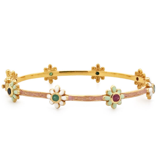 A colorful splash of pink, white, and green enamel, set with natural emeralds, rubies, and sapphires in 925 sterling silver with 22k gold vermeil. This hinged bangle features a secure clasp and a vintage-inspired palette that’s anything but shy.