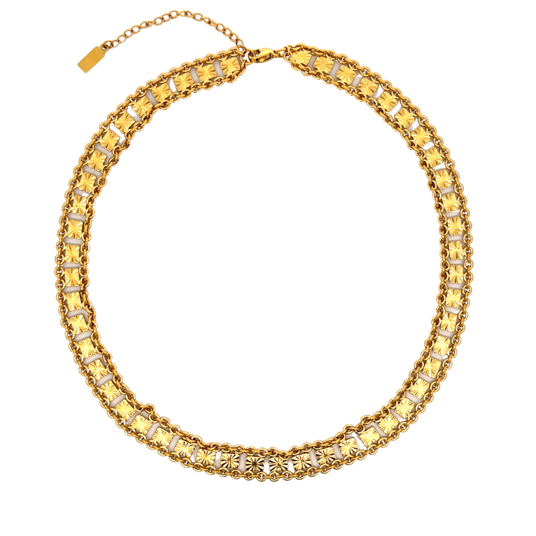 You light up every room and wear this mid-century gold choker with a hand-engraved starburst design as a reminder!