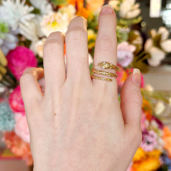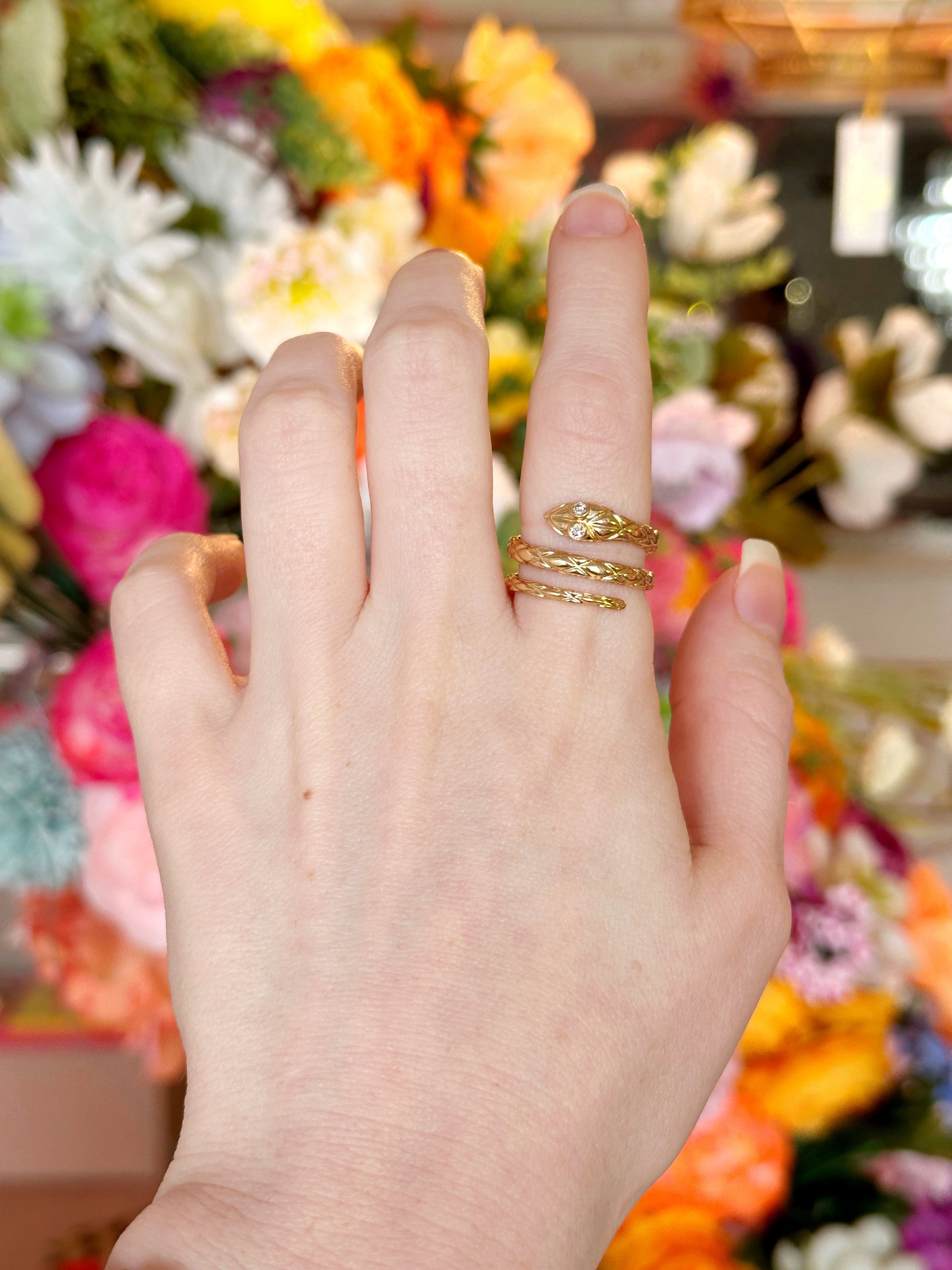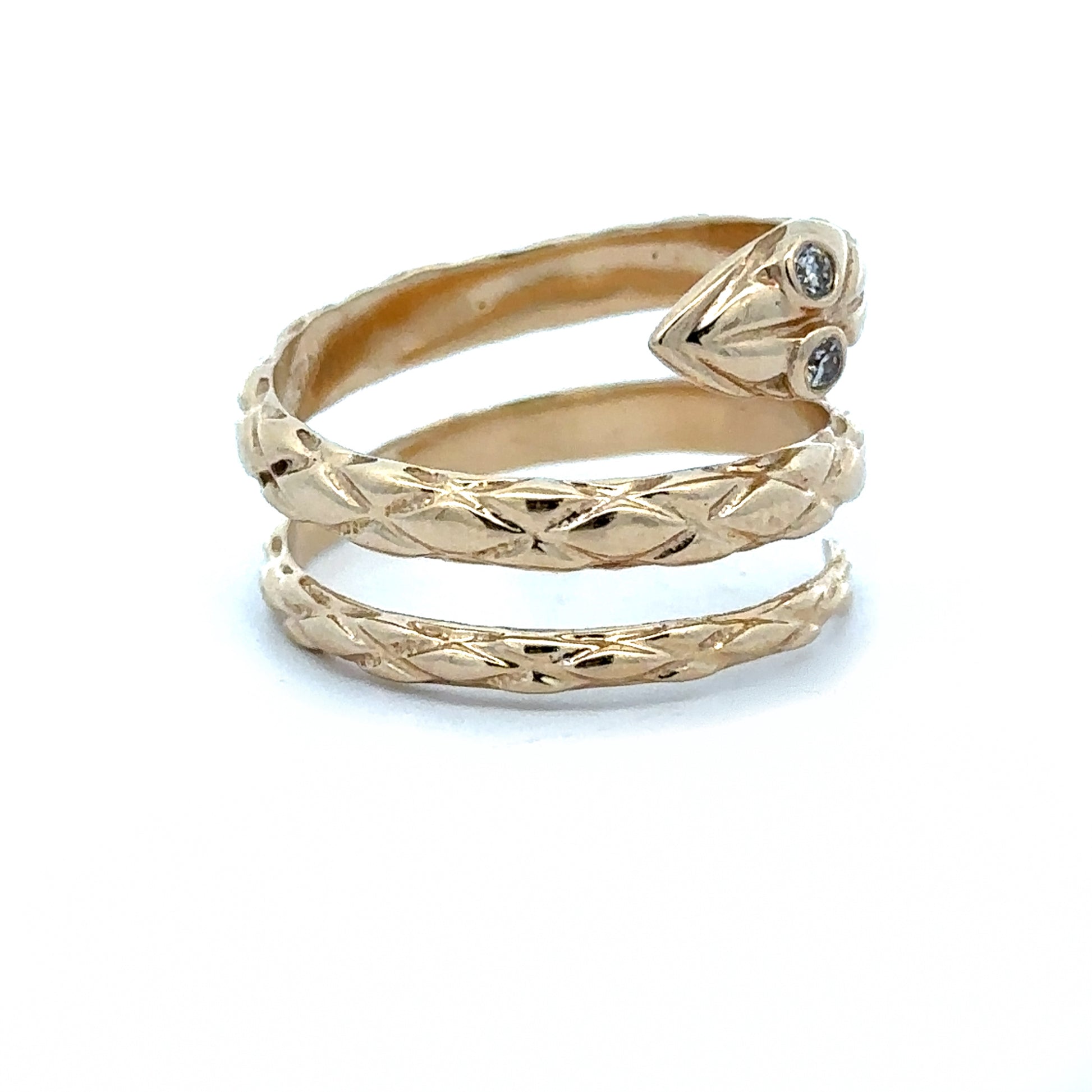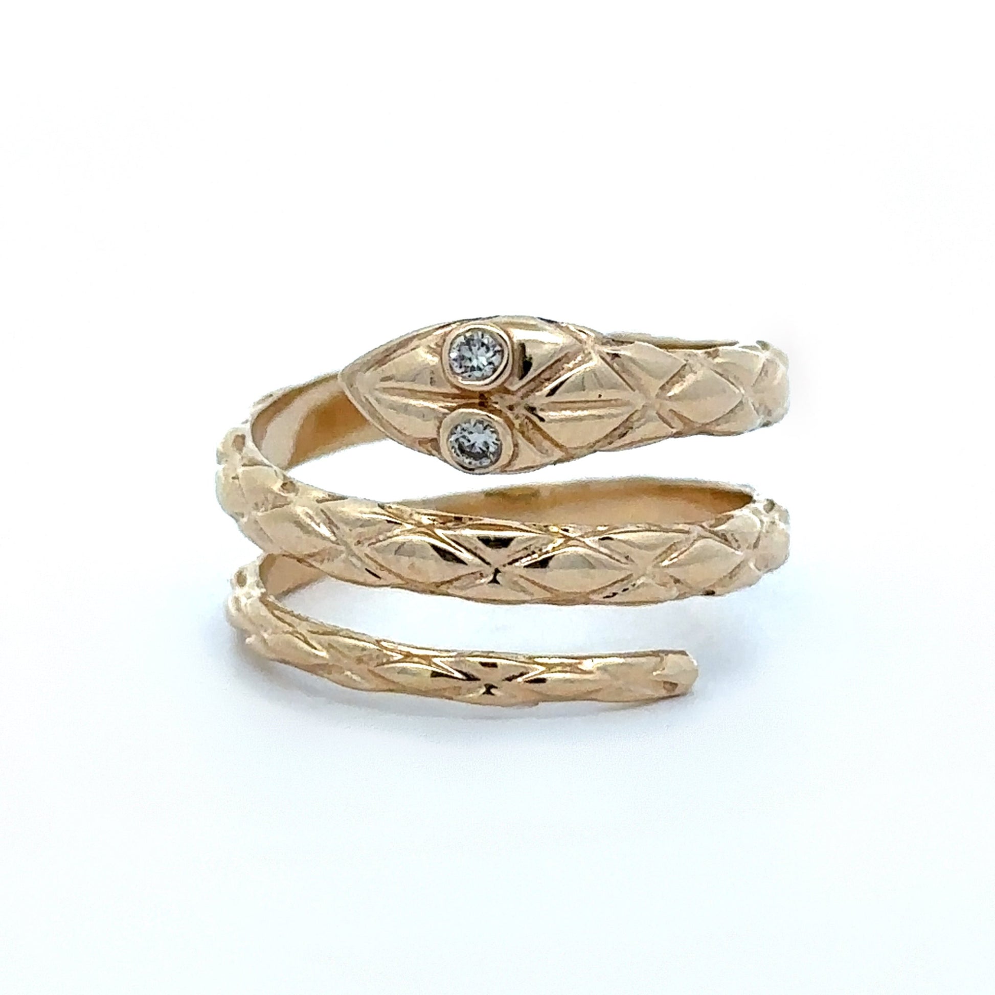 A 1970s 14k yellow gold hand-engraved snake ring featuring two bezel-set diamond eyes. A whimsical and vintage-inspired design that coils elegance and sparkle into one striking piece!