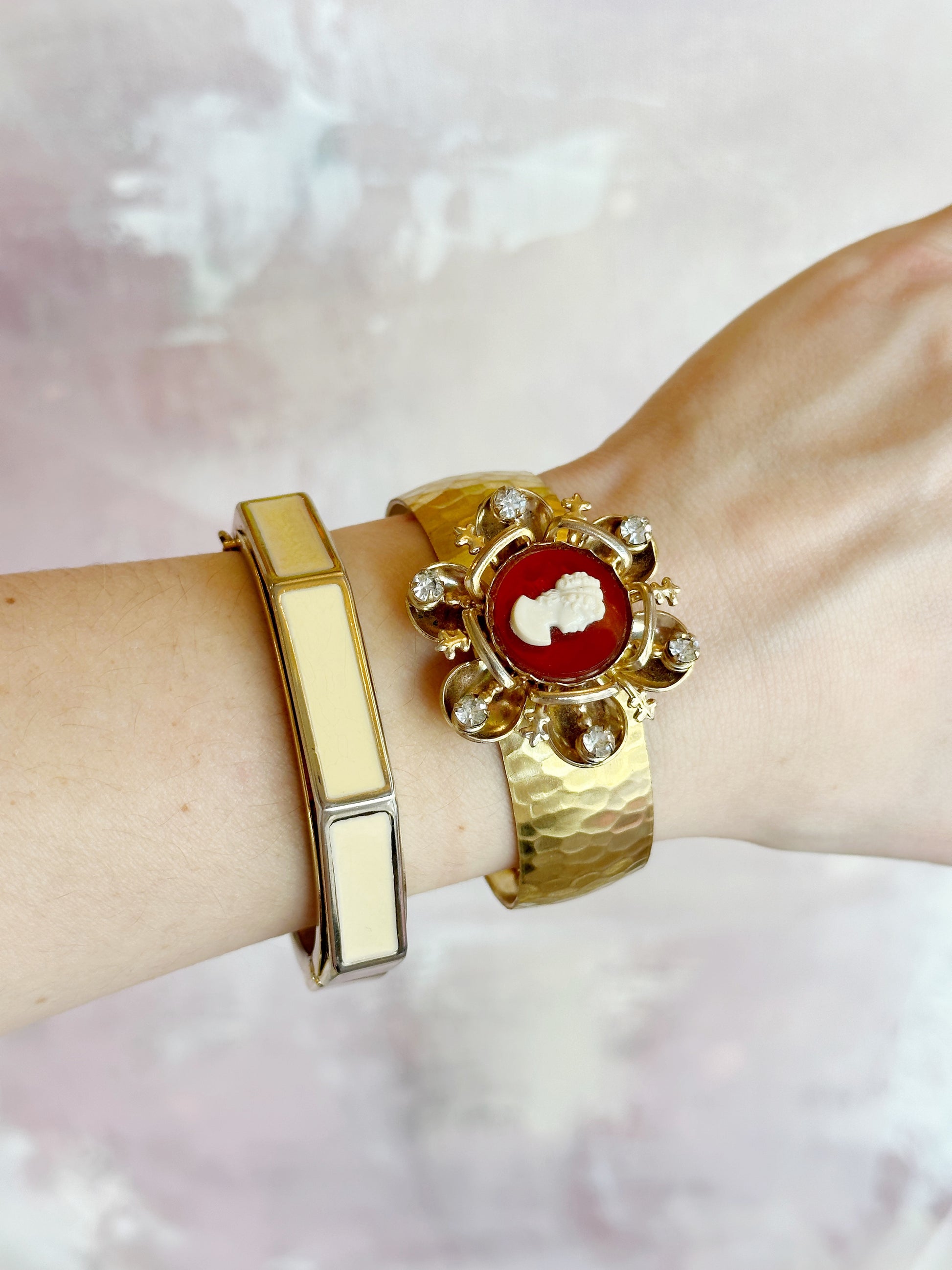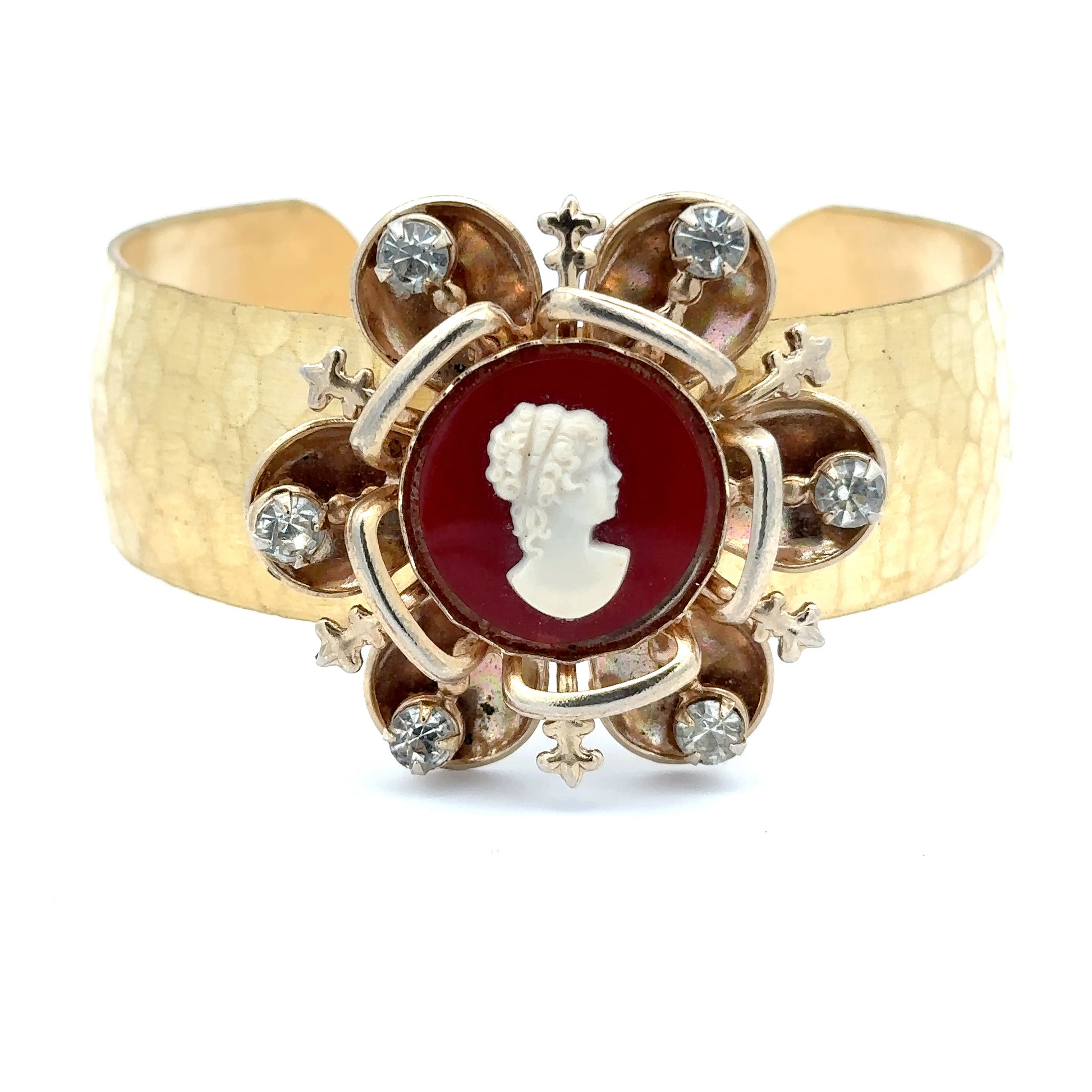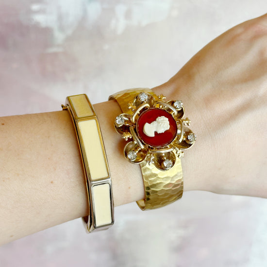 You consider jewelry to be poetry on your person, so you are naturally drawn to this beautiful 1950's cameo layered over a brass cuff!