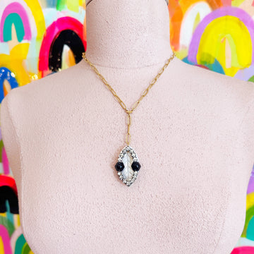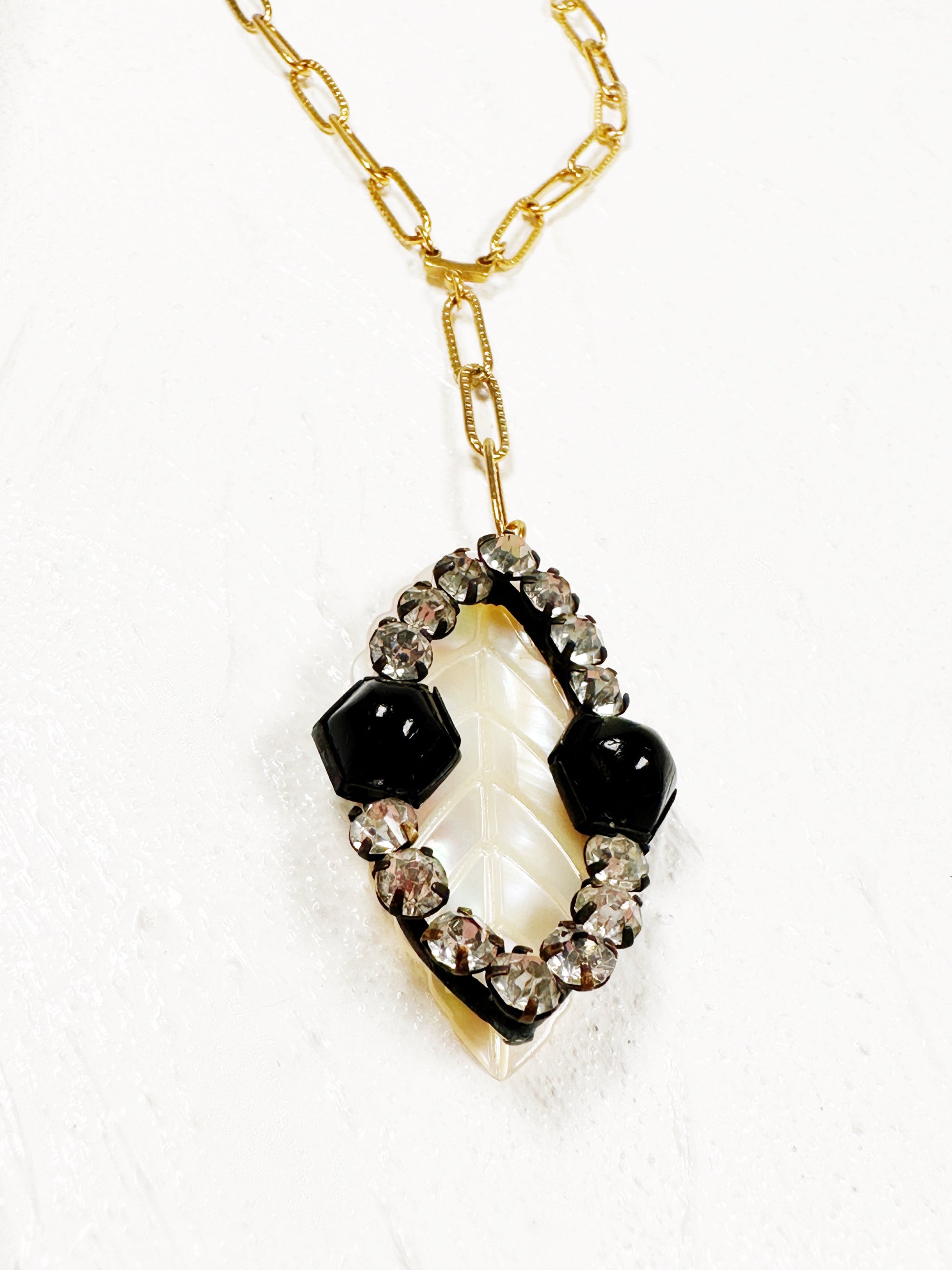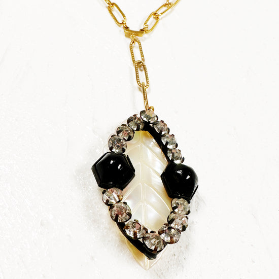 Magic is your middle name, and your jewelry reflects your life alive with wonder and curiosity! This 1940's black and rhinestone brooch layered over a mother of pearl feather is alive on every side!