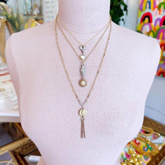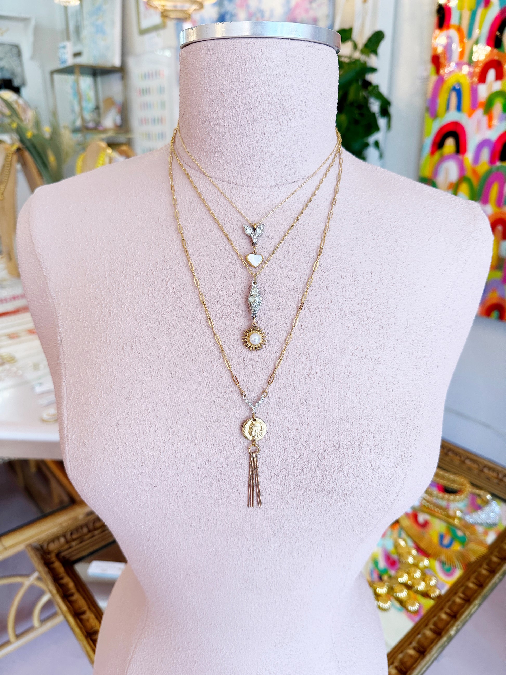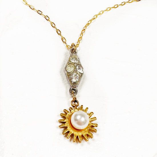You are a dreamer and a doer. You love imagining your future as much as you love creating it! Which is why you connect with this 1940's rhinestone accented with a gold sun and pearl charm hung from gold paperclip chain.