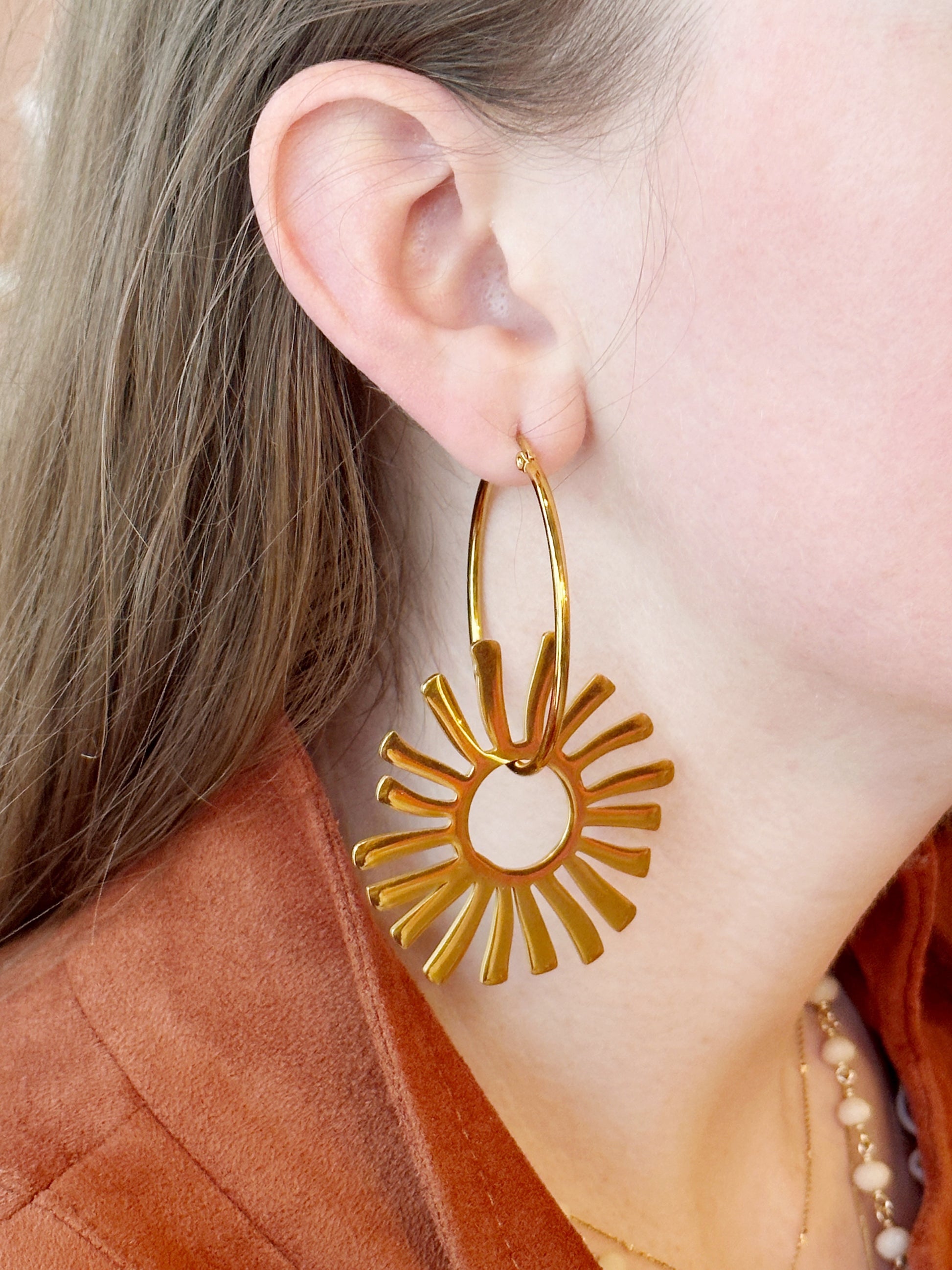 Follow the LIGHT…and the LIGHT HEARTED! Let your accessories be full of bright and abundant PLAY and POSSIBILITY! We have created custom, lightweight, tarnish-free suns as the perfect base for these tarnish free hoops!