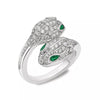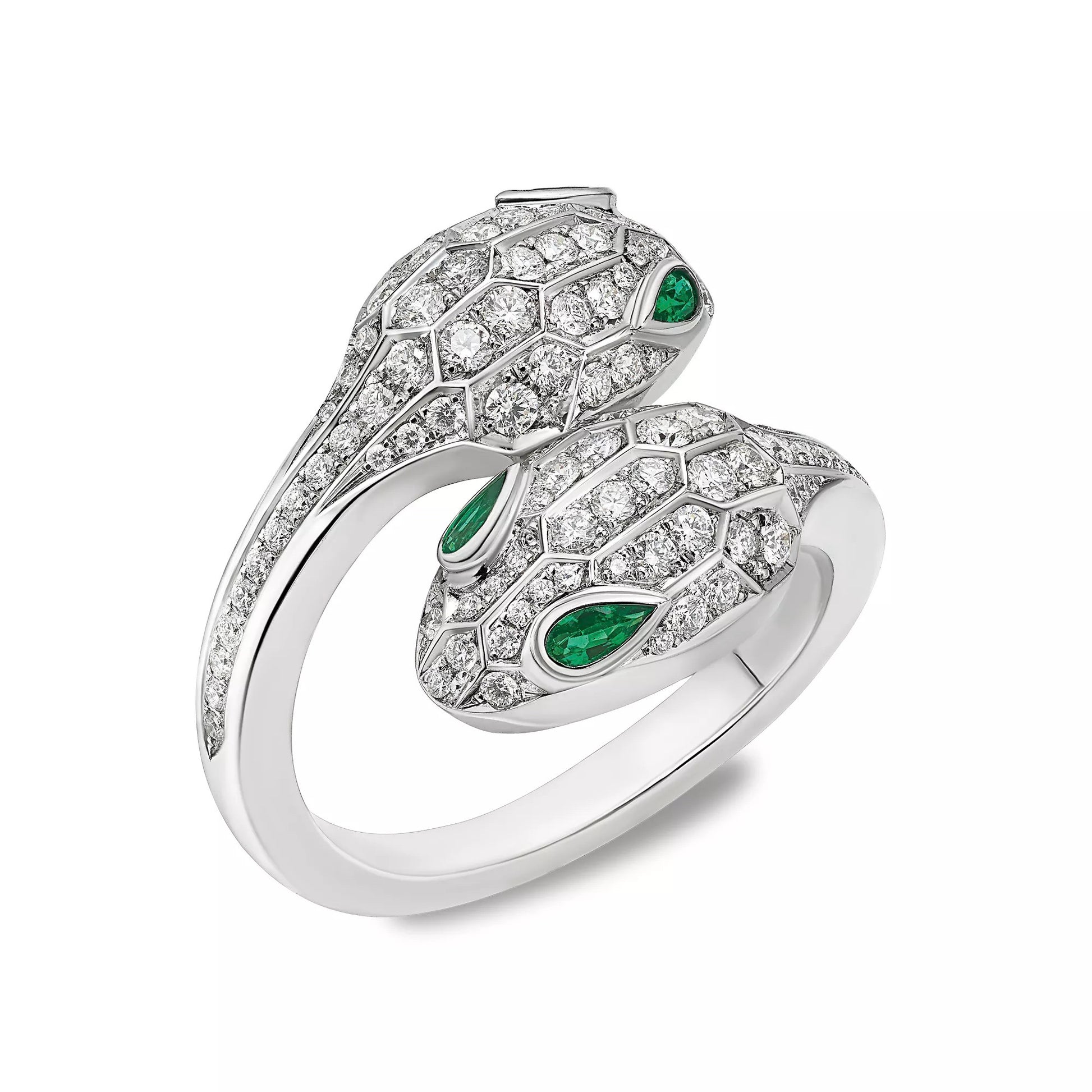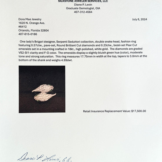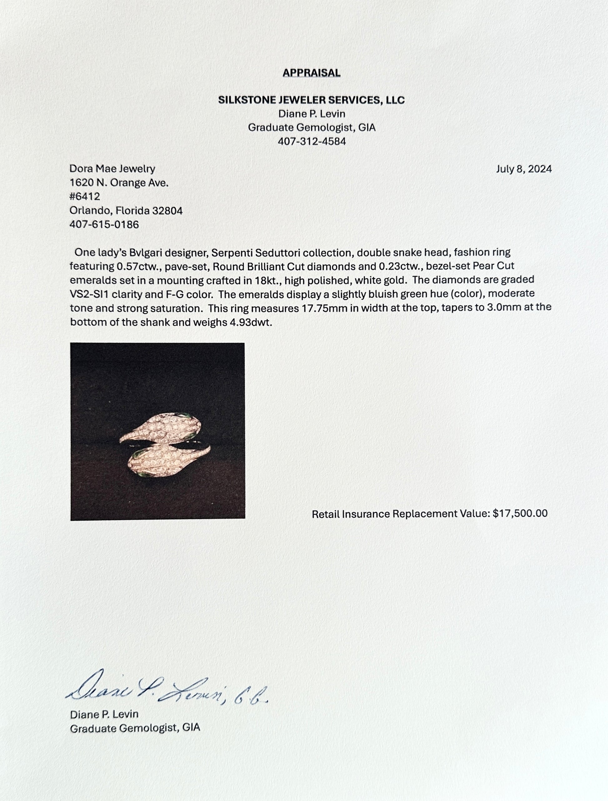 A genuine Bvlgari Serpenti ring cast in 18k white gold featuring pavé-set round brilliant cut diamonds totaling 0.57 carats and bezel-set pear-cut emeralds totaling 0.23 carats. Made in Italy, this iconic piece coils luxury, sparkle, and style into one stunning design!