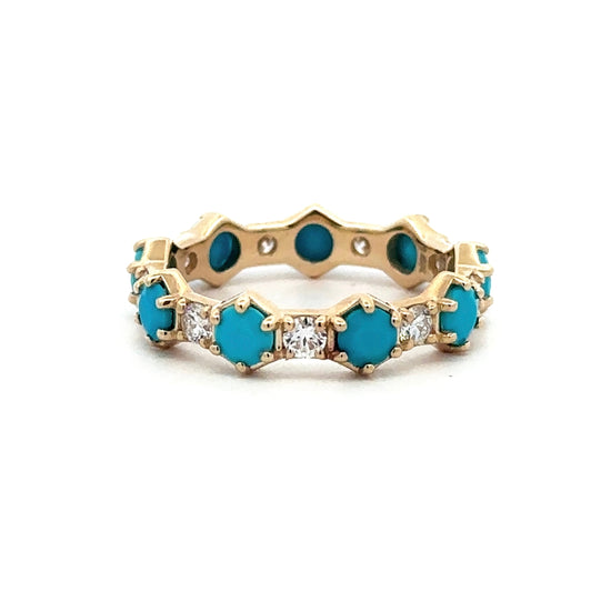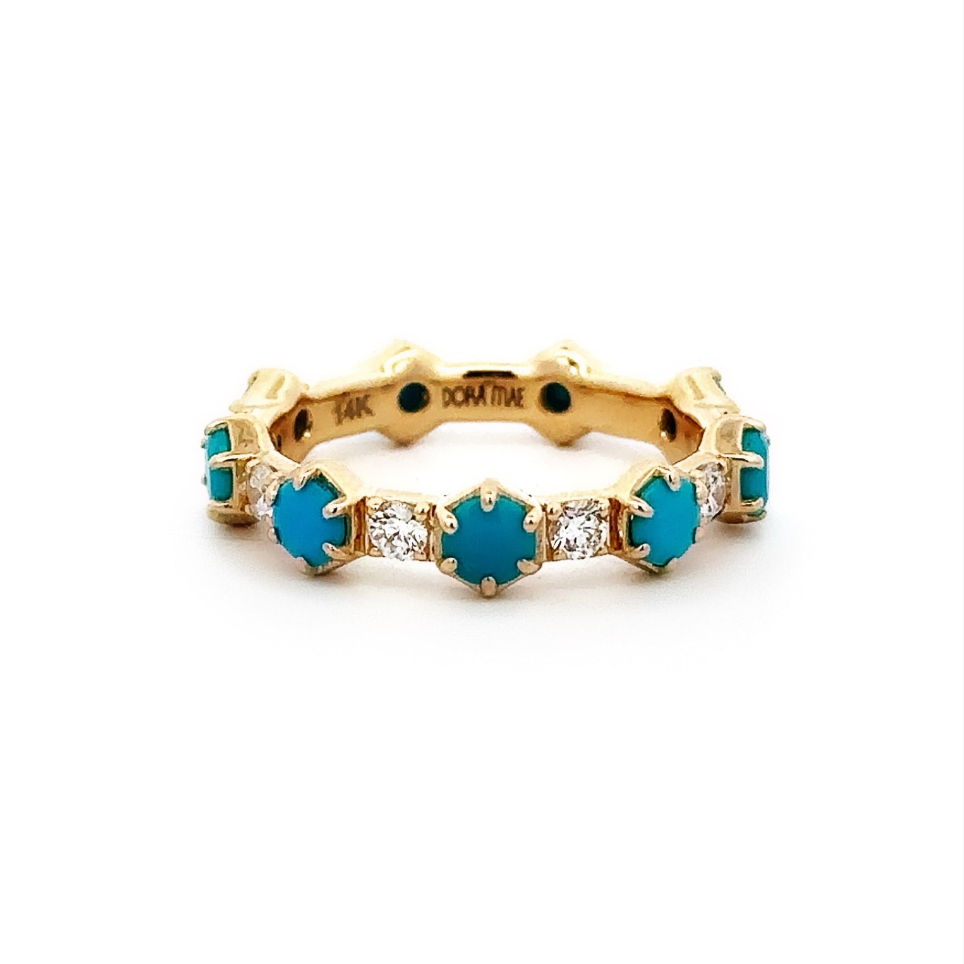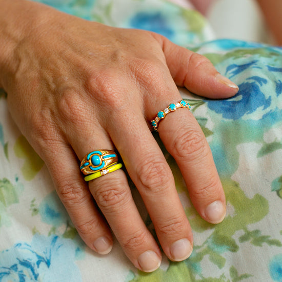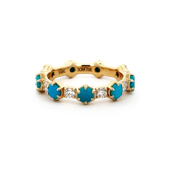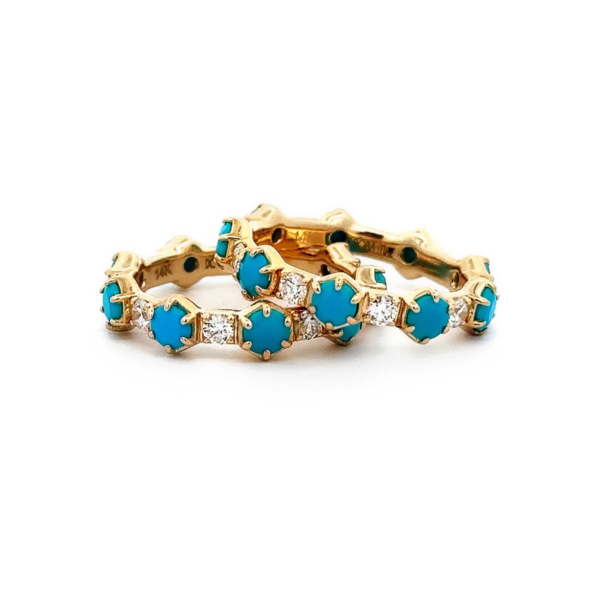 "Starley" in her classic form consists of turquoise and diamonds set in 14k yellow gold. We can customize this design with any stone combination and setting your heart desires!