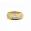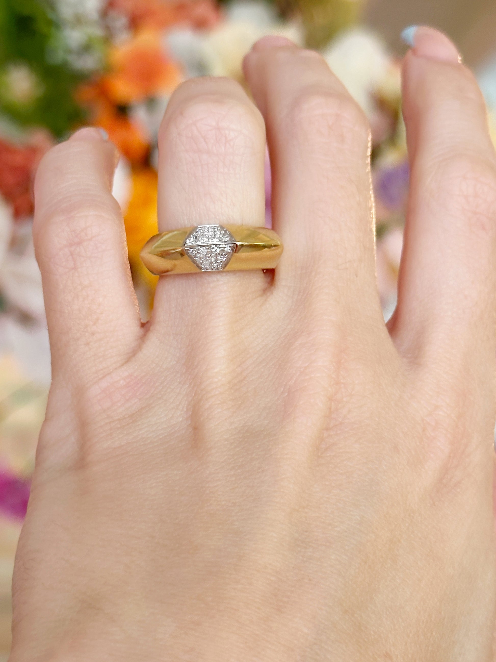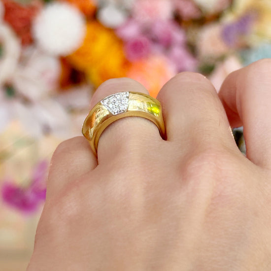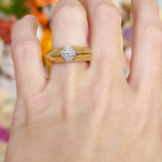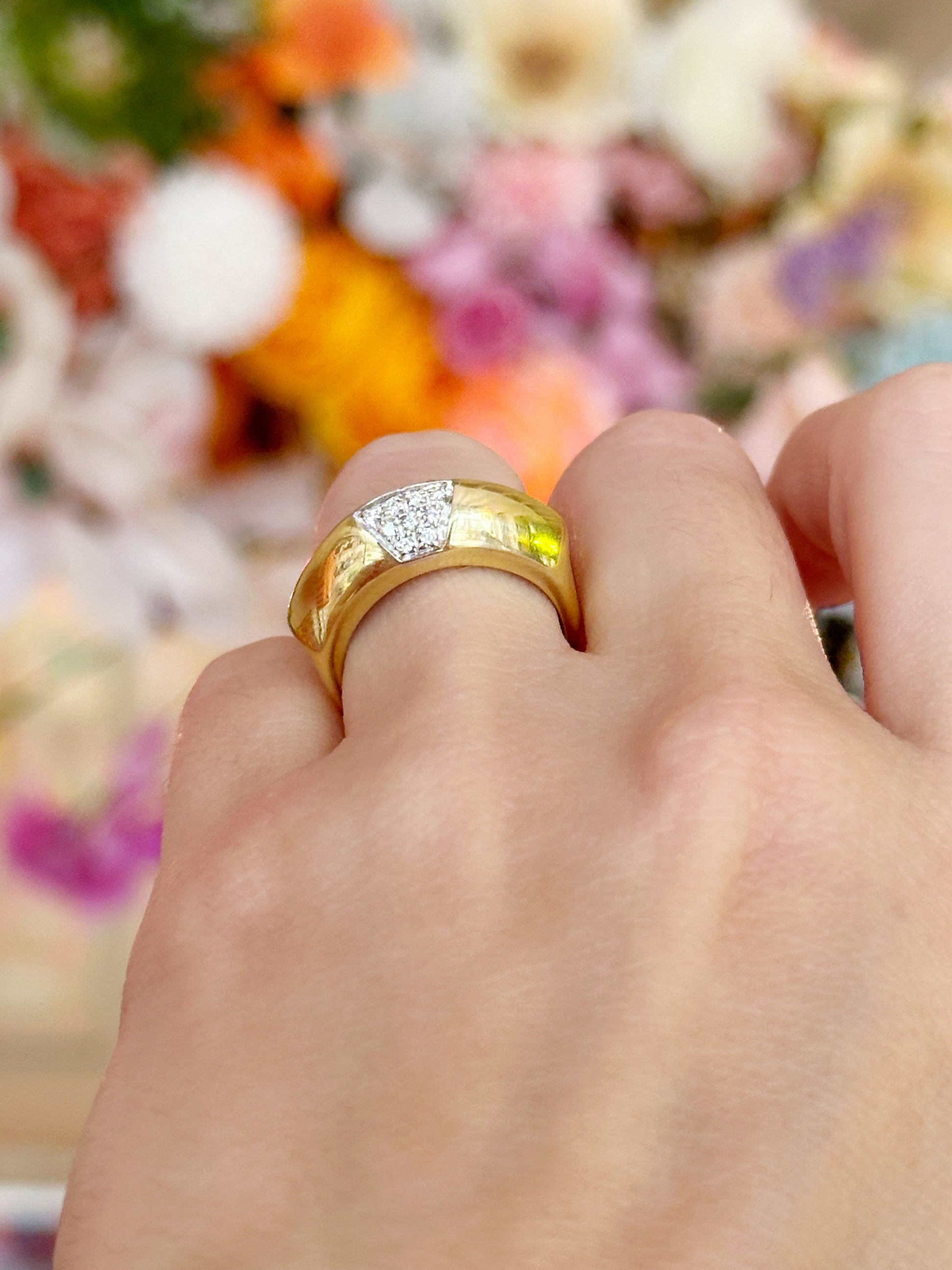 A 1970s 18k white and yellow gold almond knife-edge ring featuring pavé-set diamonds totaling 0.28 carats and weighing 7.7 grams. Sleek, vintage-inspired, and sparkling from every angle!