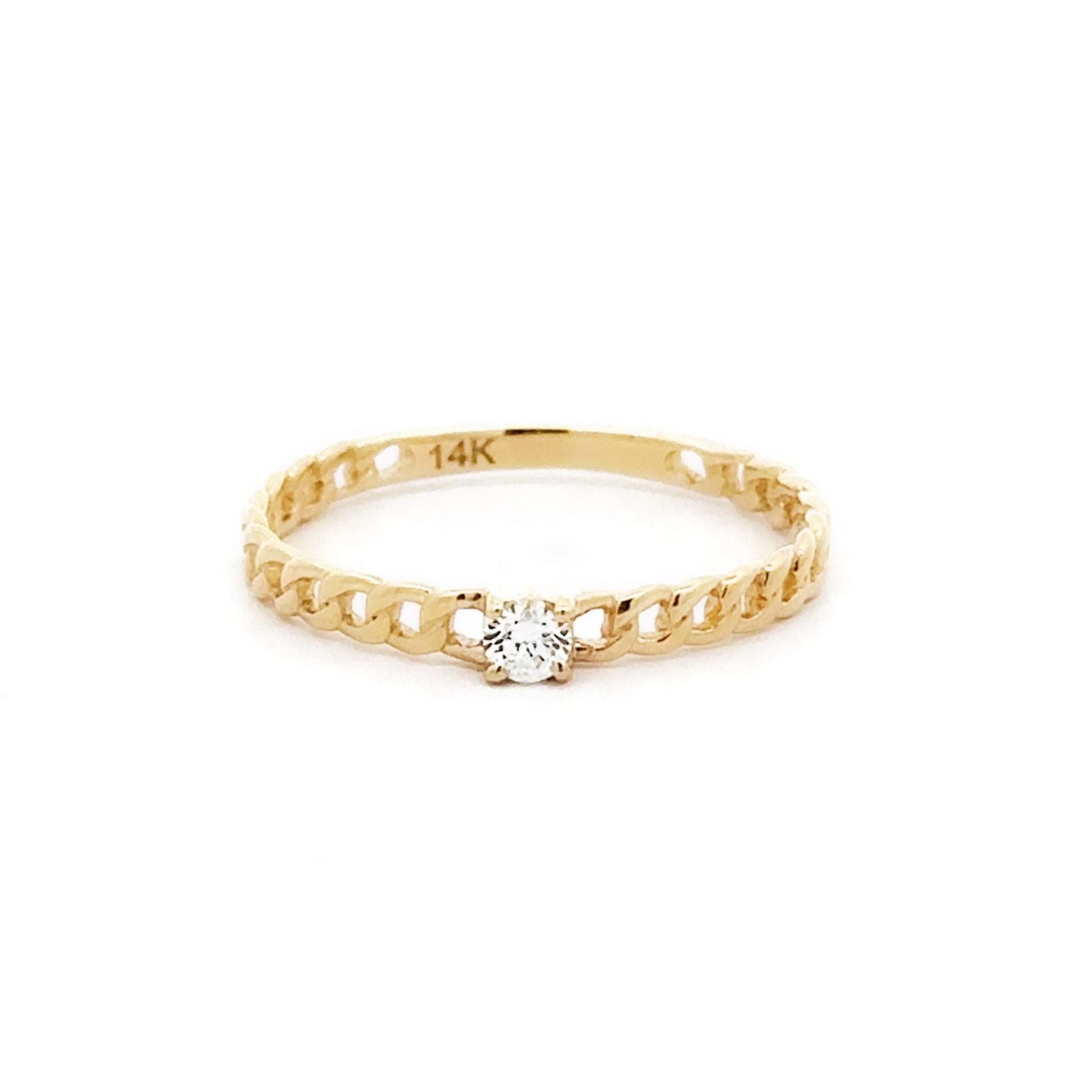 "Toni" in her classic form is a 14k yellow gold ring (1.02 grams) featuring a chain-like pattern and accented by one prong-set diamond (0.08 carats). Subtle, stylish, and perfect for adding a little sparkle to your everyday look!