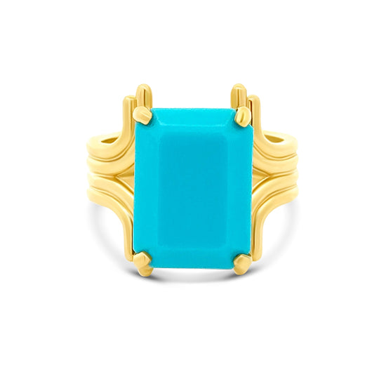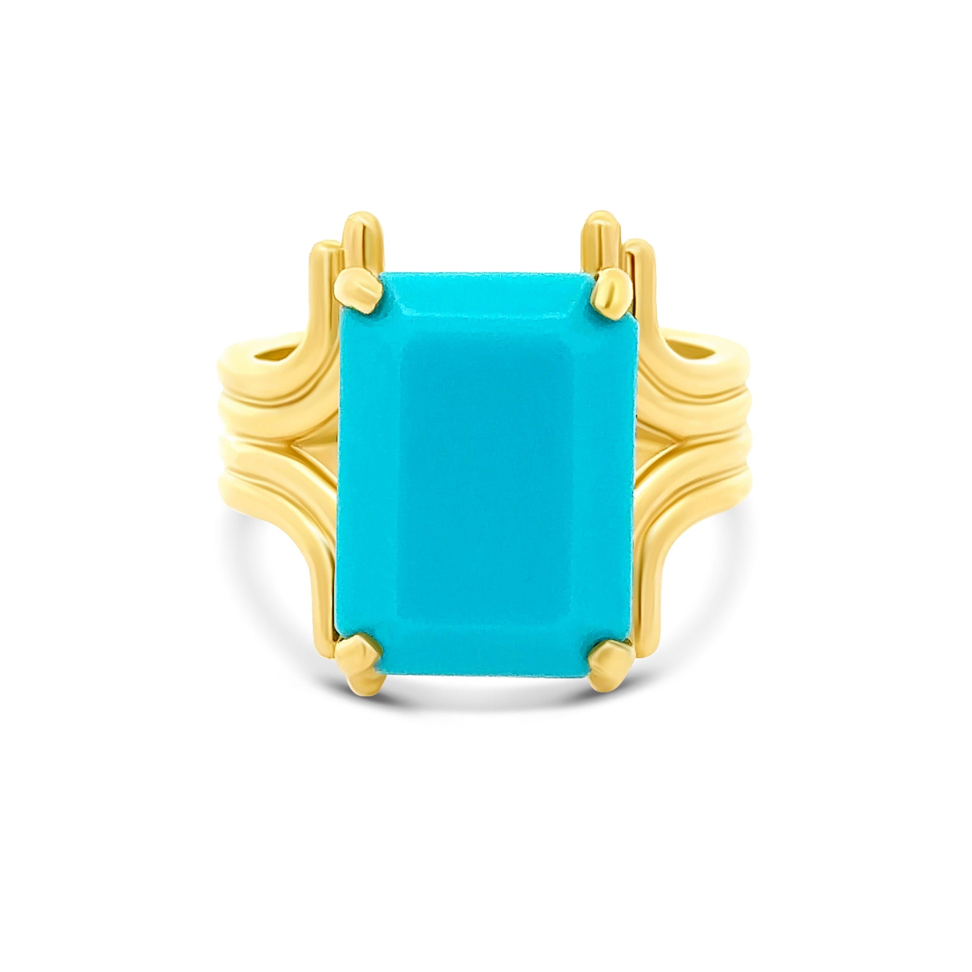 "Hera" in her classic form is a striking Mid-Century ring featuring a vibrant 10x7 mm Sleeping Beauty Turquoise (AA, clean), set in 14k yellow gold. The piece weighs 5.3 dwt, showcasing bold vintage elegance.