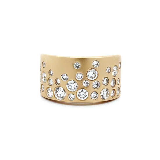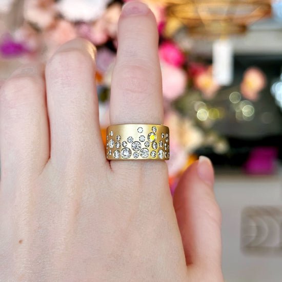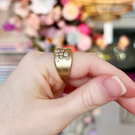 A 14k yellow gold ring weighing approximately 8.50 grams, featuring 32 natural diamonds in varying sizes (VS1 clarity, EF color), totaling approximately 1.5 carats. A dazzling showstopper that’s impossible not to notice!