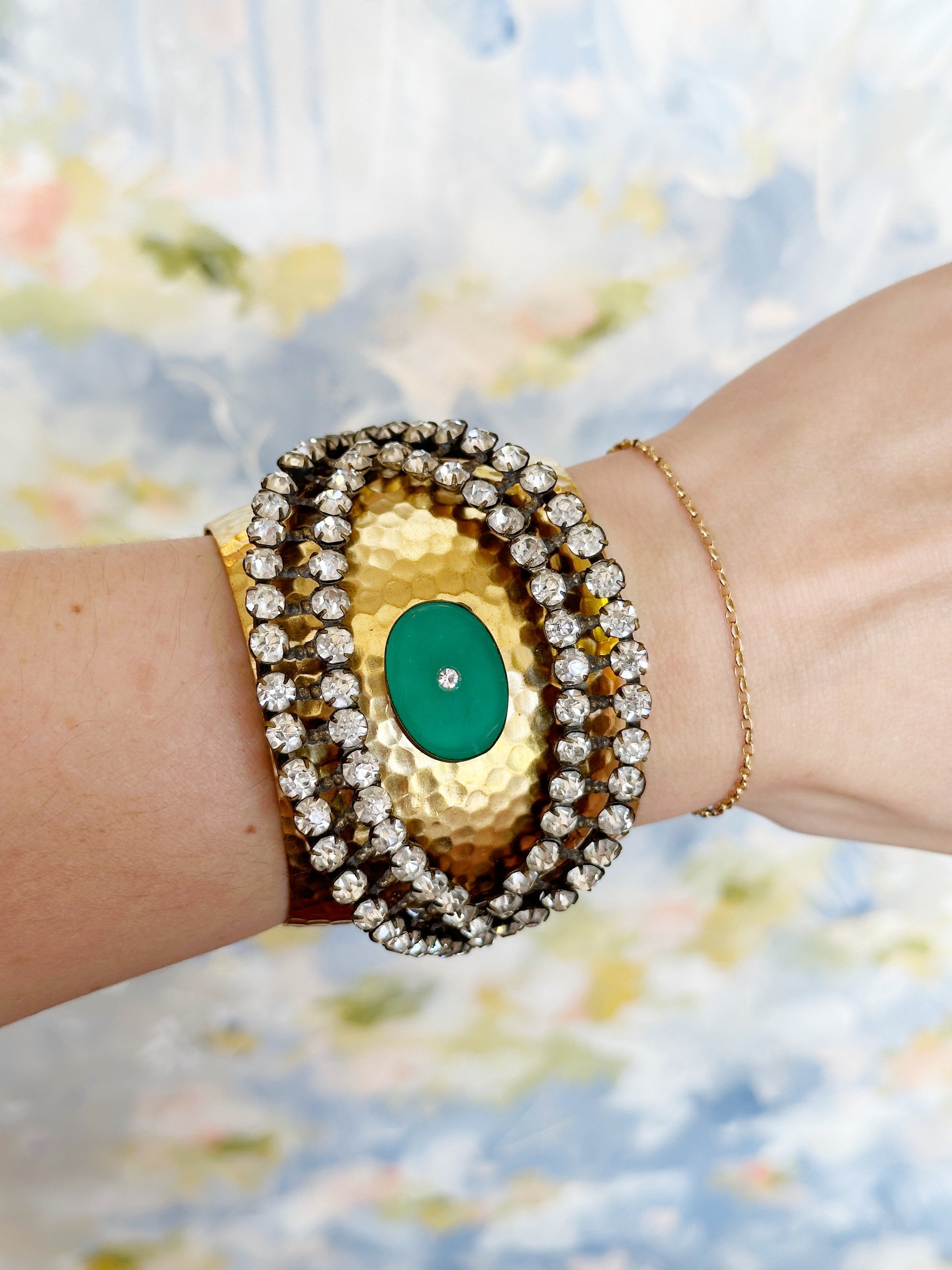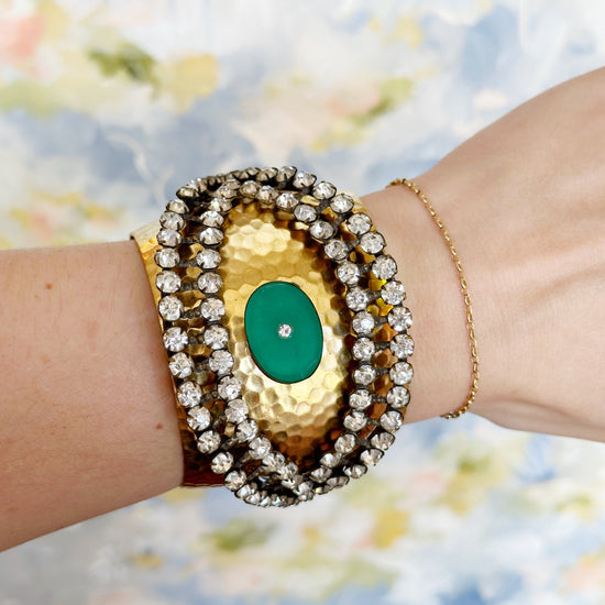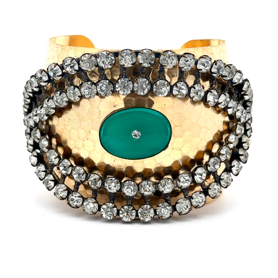You consider jewelry to be poetry on your person, so you are naturally drawn to this beautiful 1950's rhinestone eye layered over a brass cuff!
