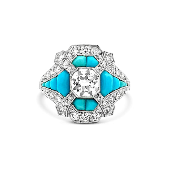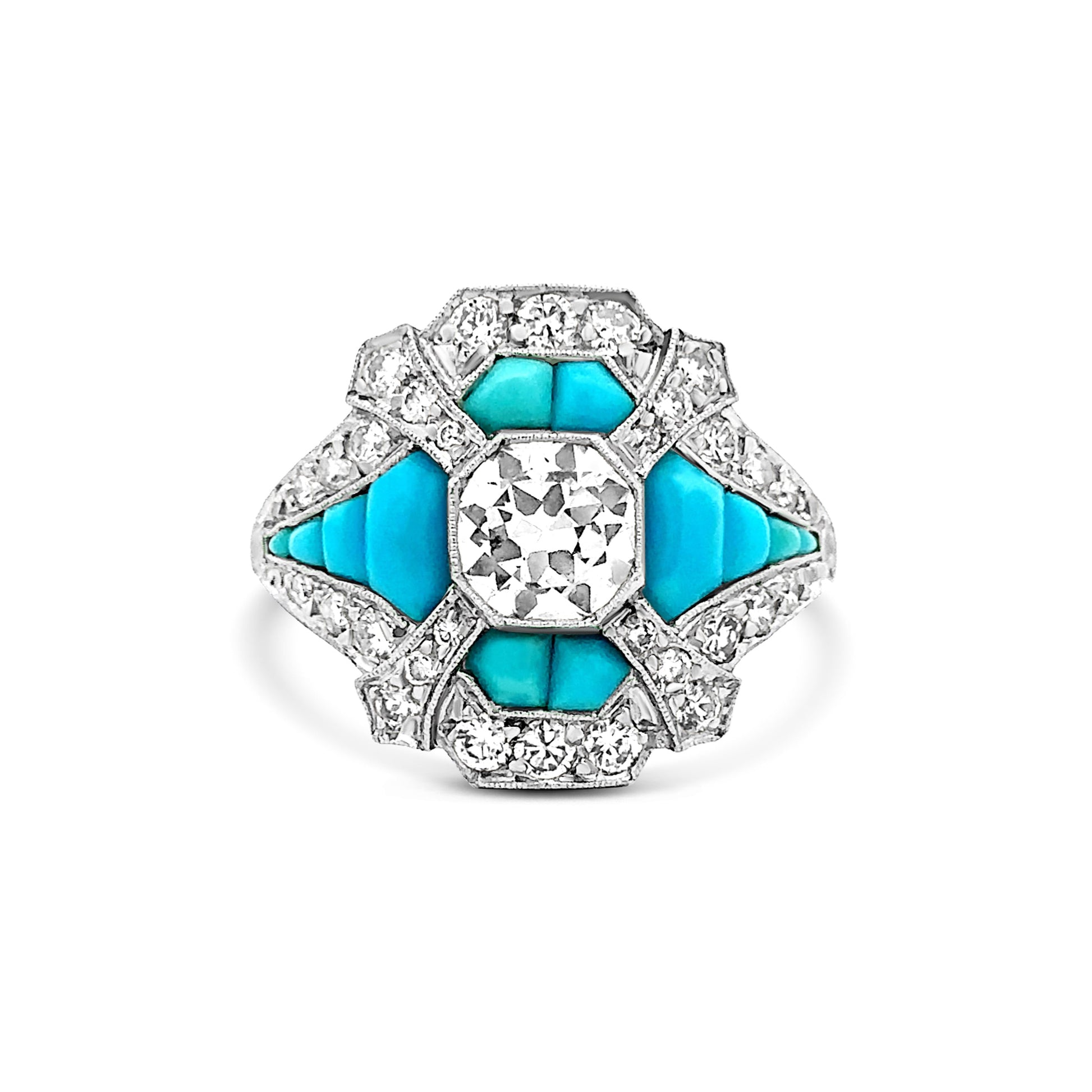 Our 1920s Art Deco hand-cut turquoise and diamond statement ring captures the bold geometry and glamour of the era. Featuring approximately 1.93 carats total weight, the carefully set turquoise and sparkling diamonds create a striking contrast, embodying the distinctive sophistication and artistic flair of Art Deco design.