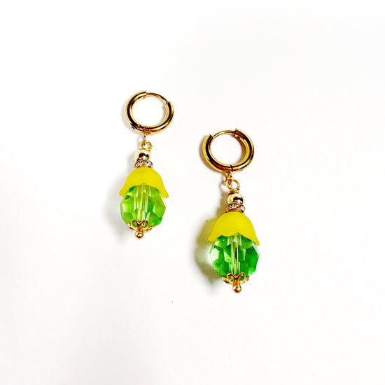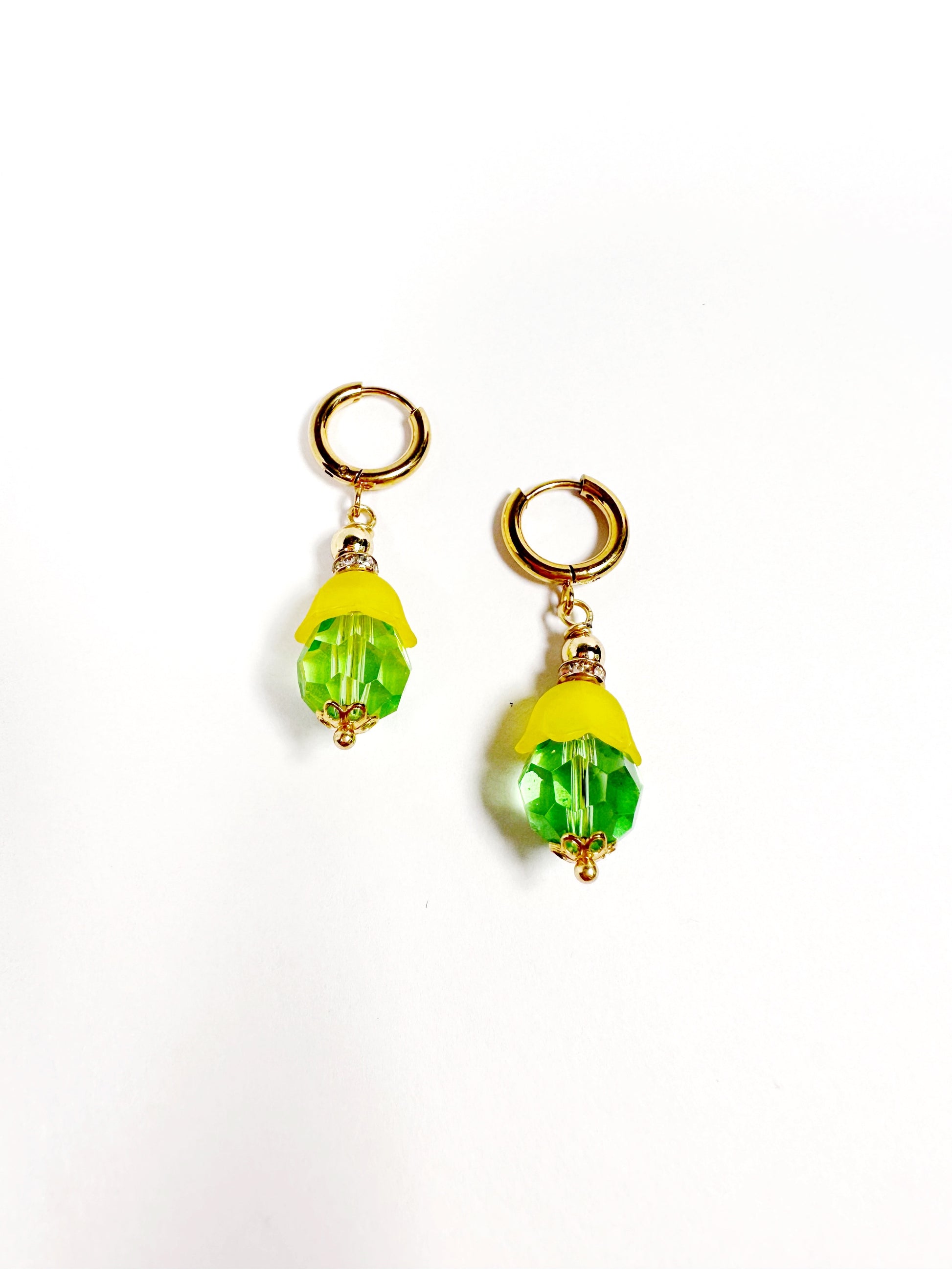 Your quiet courage becomes you. You quietly cultivate your soul AND courageously create your reality. Just like these vintage green glass beads with yellow flower caps hung from tarnish free hoops.