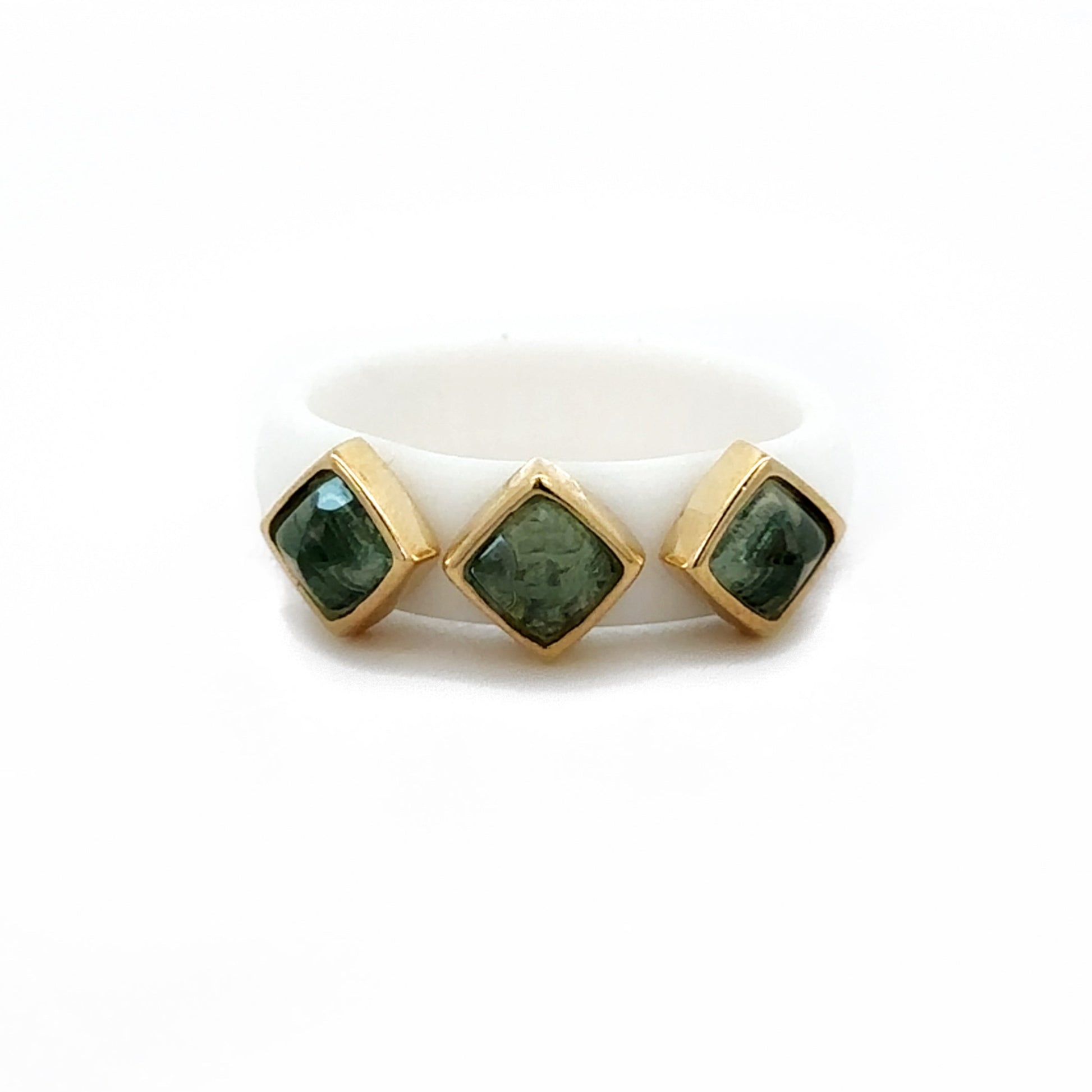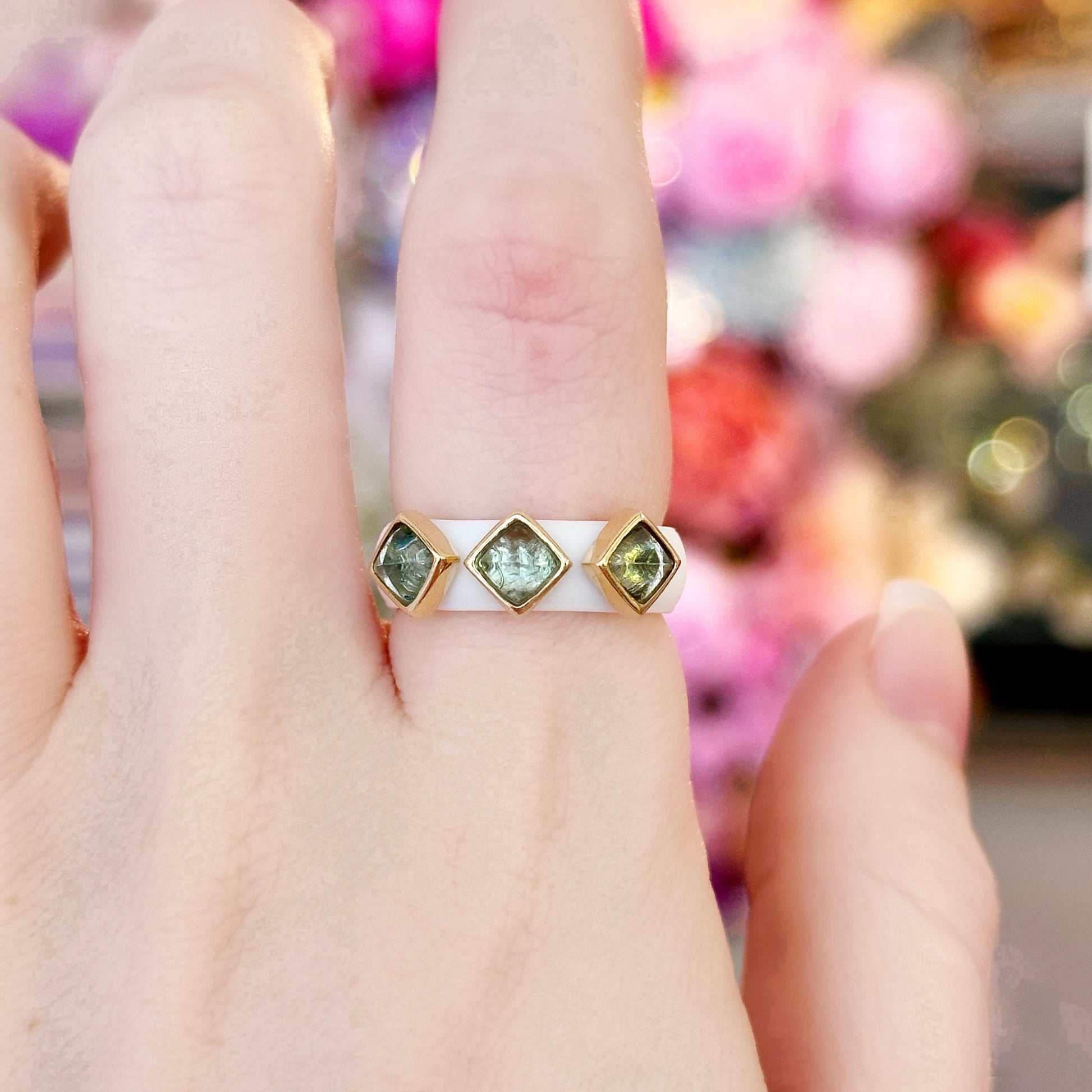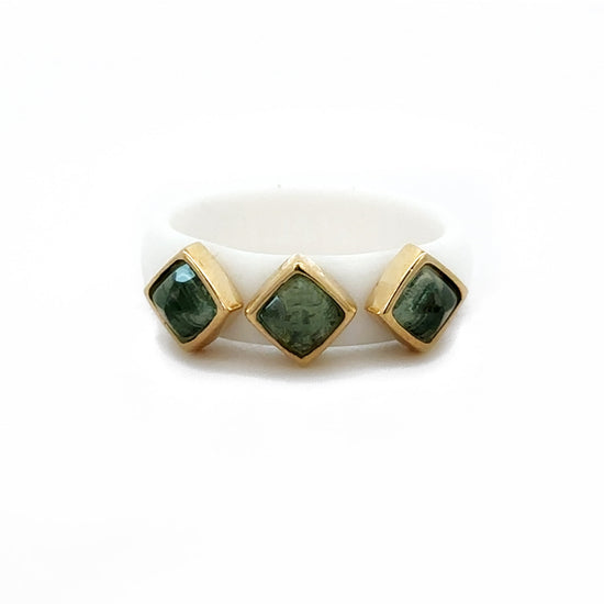 Casual Carats white silicone band featuring 3 sugarloaf blue topaz bezel-set in 14k yellow gold. Featuring bold, eye-catching stones, this ring is perfect for adding a little flair to any outfit.